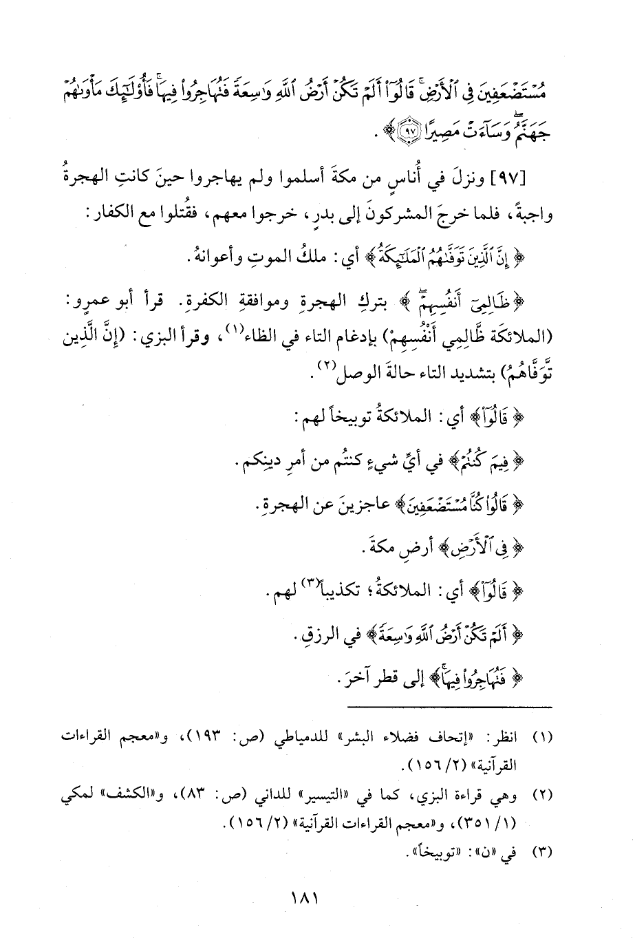 [97] ونزلَ في أُناسٍ من مكةَ أسلموا ولم يهاجروا حينَ كانتِ الهجرةُ واجبةً، فلما خرجَ المشركونَ إلى بدرٍ، خرجوا معهم، فقُتلوا مع الكفار: