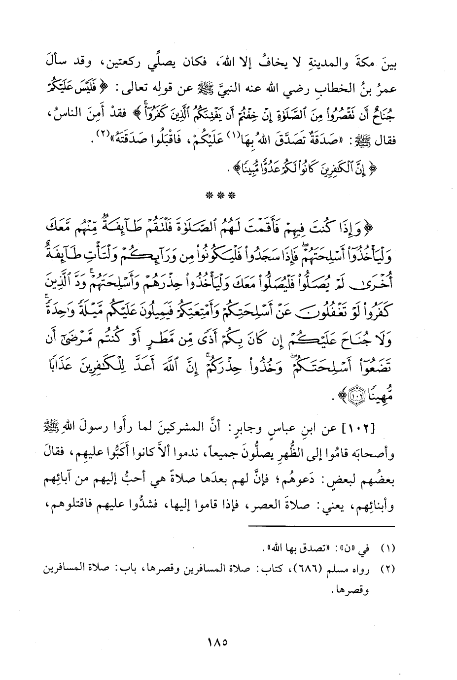 {وَإِذَا كُنْتَ فِيهِمْ فَأَقَمْتَ لَهُمُ الصَّلَاةَ فَلْتَقُمْ طَائِفَةٌ مِنْهُمْ مَعَكَ وَلْيَأْخُذُوا أَسْلِحَتَهُمْ فَإِذَا سَجَدُوا فَلْيَكُونُوا مِنْ وَرَائِكُمْ وَلْتَأْتِ طَائِفَةٌ أُخْرَى لَمْ يُصَلُّوا فَلْيُصَلُّوا مَعَكَ وَلْيَأْخُذُوا حِذْرَهُمْ وَأَسْلِحَتَهُمْ وَدَّ الَّذِينَ كَفَرُوا لَوْ تَغْفُلُونَ عَنْ أَسْلِحَتِكُمْ وَأَمْتِعَتِكُمْ فَيَمِيلُونَ عَلَيْكُمْ مَيْلَةً وَاحِدَةً وَلَا جُنَاحَ عَلَيْكُمْ إِنْ كَانَ بِكُمْ أَذًى مِنْ مَطَرٍ أَوْ كُنْتُمْ مَرْضَى أَنْ تَضَعُوا أَسْلِحَتَكُمْ وَخُذُوا حِذْرَكُمْ إِنَّ اللَّهَ أَعَدَّ لِلْكَافِرِينَ عَذَابًا مُهِينًا (102)}.