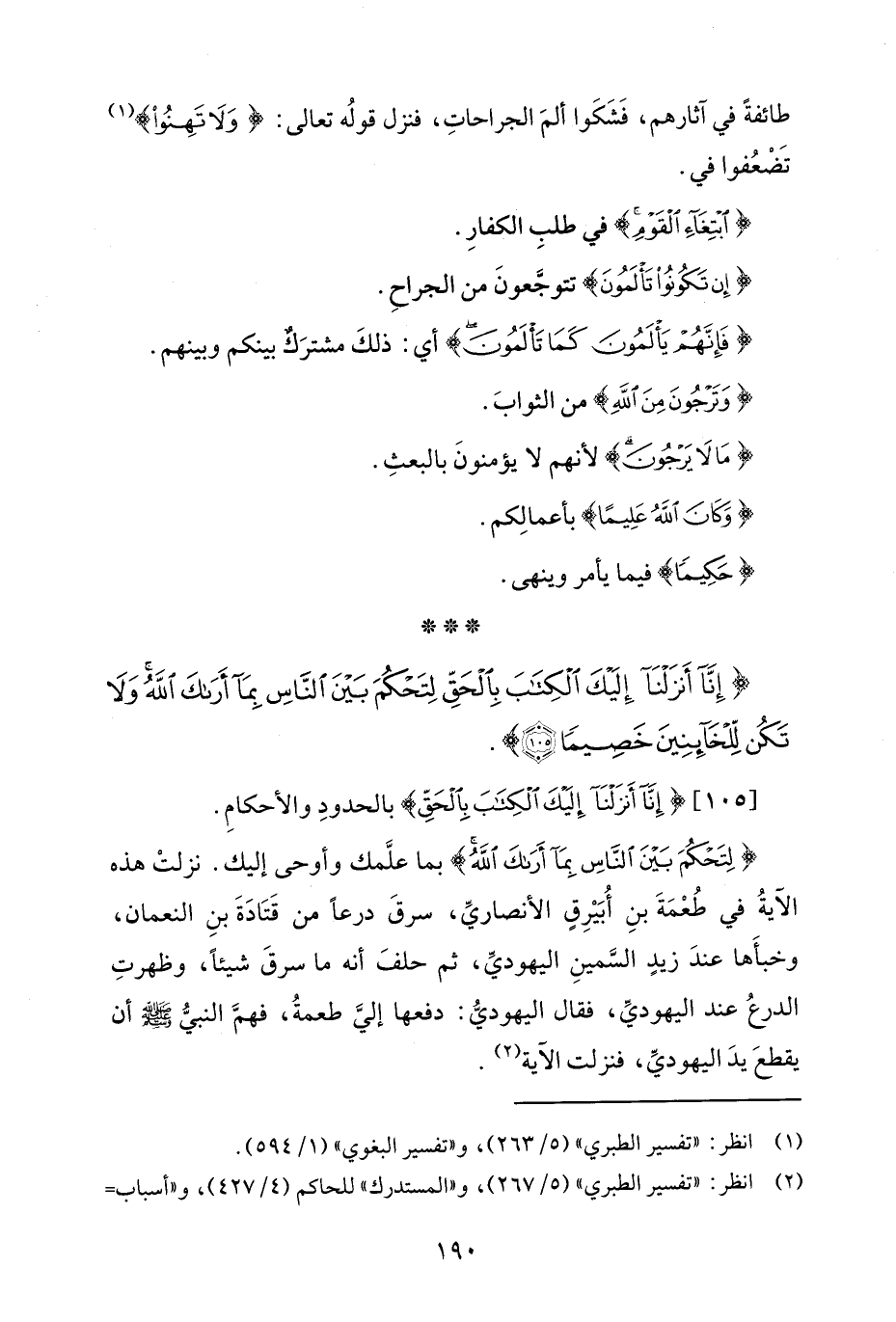 {لِتَحْكُمَ بَيْنَ النَّاسِ بِمَا أَرَاكَ اللَّهُ} بما علَّمك وأوحى إليك. نزلتْ هذه الآيةُ في طُعْمَةَ بنِ أُبَيْرِقٍ الأنصاريِّ، سرقَ درعًا من قَتَادَةَ بنِ النعمان، وخبأَها عندَ زيدٍ السَّمينِ اليهوديِّ، ثم حلفَ أنه ما سرقَ شيئًا، وظهرتِ الدرعُ عند اليهوديِّ، فقال اليهوديُّ: دفعها إليَّ طعمةُ، فهمَّ النبيُّ - صلى الله عليه وسلم - أن يقطعَ يدَ اليهوديِّ، فنزلت الآية (¬2).