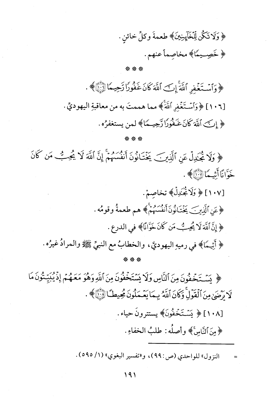 {وَلَا تُجَادِلْ عَنِ الَّذِينَ يَخْتَانُونَ أَنْفُسَهُمْ إِنَّ اللَّهَ لَا يُحِبُّ مَنْ كَانَ خَوَّانًا أَثِيمًا (107)}.
