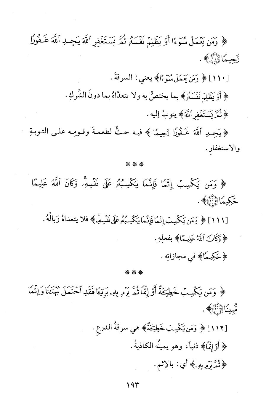 {وَمَنْ يَعْمَلْ سُوءًا أَوْ يَظْلِمْ نَفْسَهُ ثُمَّ يَسْتَغْفِرِ اللَّهَ يَجِدِ اللَّهَ غَفُورًا رَحِيمًا (110)}.