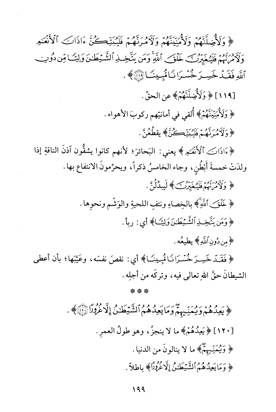 {وَلَأُضِلَّنَّهُمْ وَلَأُمَنِّيَنَّهُمْ وَلَآمُرَنَّهُمْ فَلَيُبَتِّكُنَّ آذَانَ الْأَنْعَامِ وَلَآمُرَنَّهُمْ فَلَيُغَيِّرُنَّ خَلْقَ اللَّهِ وَمَنْ يَتَّخِذِ الشَّيْطَانَ وَلِيًّا مِنْ دُونِ اللَّهِ فَقَدْ خَسِرَ خُسْرَانًا مُبِينًا (119)}.
