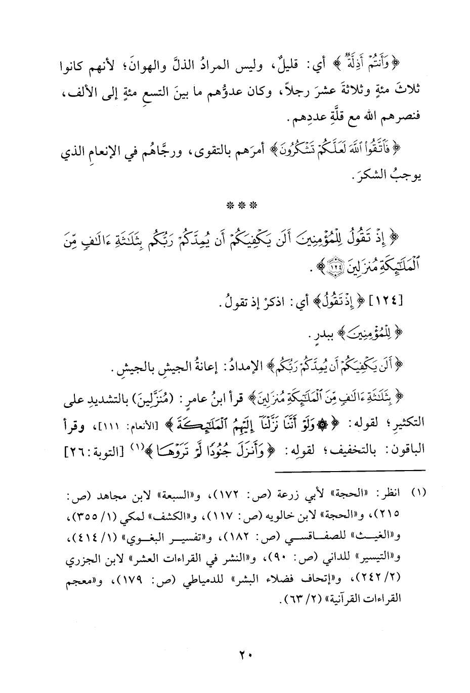 {بِثَلَاثَةِ آلَافٍ مِنَ الْمَلَائِكَةِ مُنْزَلِينَ} قرأ ابنُ عامرٍ: (مُنَزَّلينَ) بالتشديدِ على التكثيرِ؛ لقوله: {وَلَوْ أَنَّنَا نَزَّلْنَا إِلَيْهِمُ الْمَلَائِكَةَ} [الأنعام: 111]، وقرأ الباقون: بالتخفيف؛ لقوله: {وَأَنْزَلَ جُنُودًا لَمْ تَرَوْهَا} (¬1) [التوبة: 26]