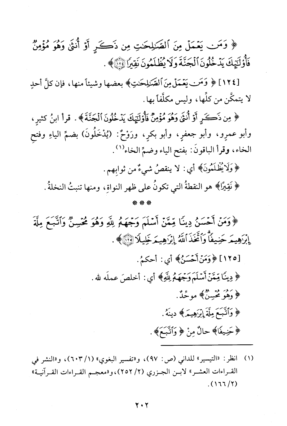 {وَمَنْ يَعْمَلْ مِنَ الصَّالِحَاتِ مِنْ ذَكَرٍ أَوْ أُنْثَى وَهُوَ مُؤْمِنٌ فَأُولَئِكَ يَدْخُلُونَ الْجَنَّةَ وَلَا يُظْلَمُونَ نَقِيرًا (124)}.