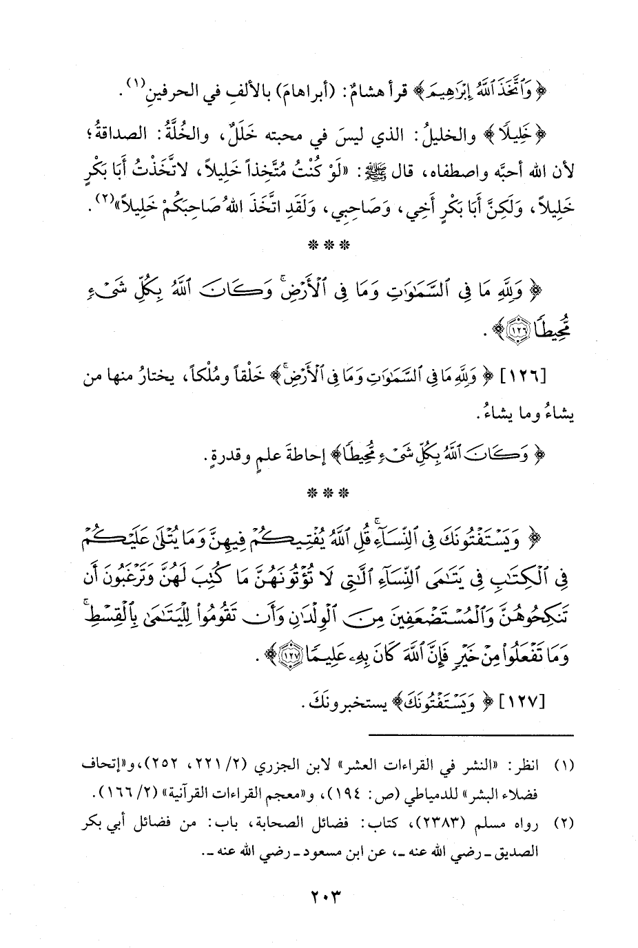 {وَاتَّخَذَ اللَّهُ إِبْرَاهِيمَ} قرأ هشامٌ: (أبراهامَ) بالألفِ في الحرفينِ (¬1).