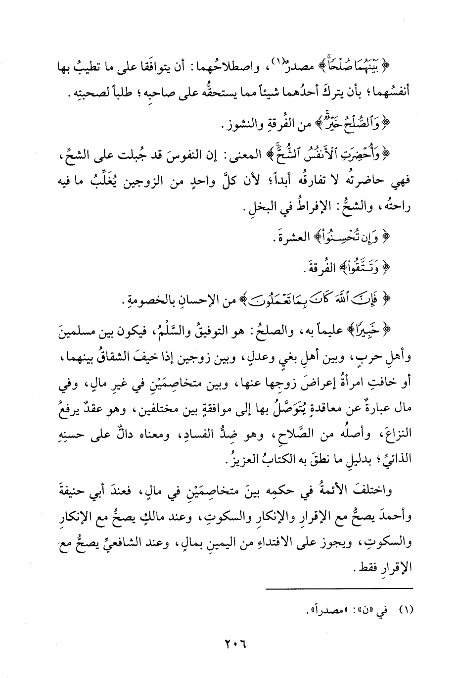 {خَبِيرًا} عليمًا به، والصلحُ: هو التوفيقُ والسَّلْمُ، فيكون بين مسلمينَ وأهلِ حربٍ، وبين أهلِ بغيٍ وعدلٍ، وبين زوجين إذا خيفَ الشقاقُ بينهما، أو خافتِ امرأةٌ إعراضَ زوجِها عنها، وبين متخاصِمَيْنِ في غيرِ مالٍ، وفي مال عبارةٌ عن معاقدةٍ يُتَوَصَّلُ بها إلى موافقةٍ بين مختلفين، وهو عقدٌ يرفعُ النزاعَ، وأصلُه من الصَّلاحِ، وهو ضِدُّ الفسادِ، ومعناه دالٌّ على حسنِهِ الذاتيِّ، بدليلِ ما نطقَ به الكتابُ العزيزُ.