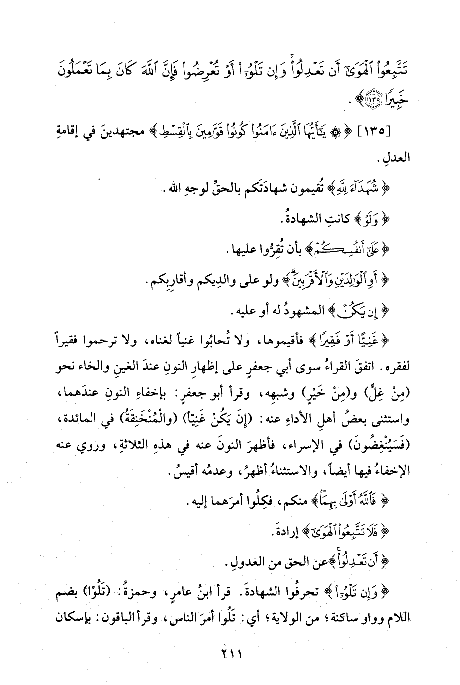 [135] {يَاأَيُّهَا الَّذِينَ آمَنُوا كُونُوا قَوَّامِينَ بِالْقِسْطِ} مجتهدينَ في إقامةِ العدلِ.