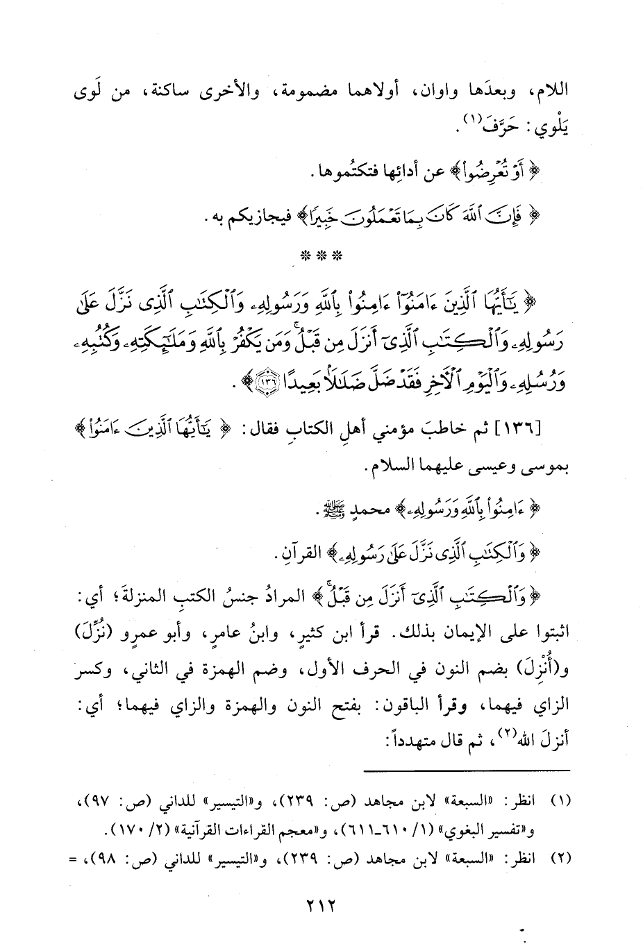 {يَاأَيُّهَا الَّذِينَ آمَنُوا آمِنُوا بِاللَّهِ وَرَسُولِهِ وَالْكِتَابِ الَّذِي نَزَّلَ عَلَى رَسُولِهِ وَالْكِتَابِ الَّذِي أَنْزَلَ مِنْ قَبْلُ وَمَنْ يَكْفُرْ بِاللَّهِ وَمَلَائِكَتِهِ وَكُتُبِهِ وَرُسُلِهِ وَالْيَوْمِ الْآخِرِ فَقَدْ ضَلَّ ضَلَالًا بَعِيدًا (136)}.