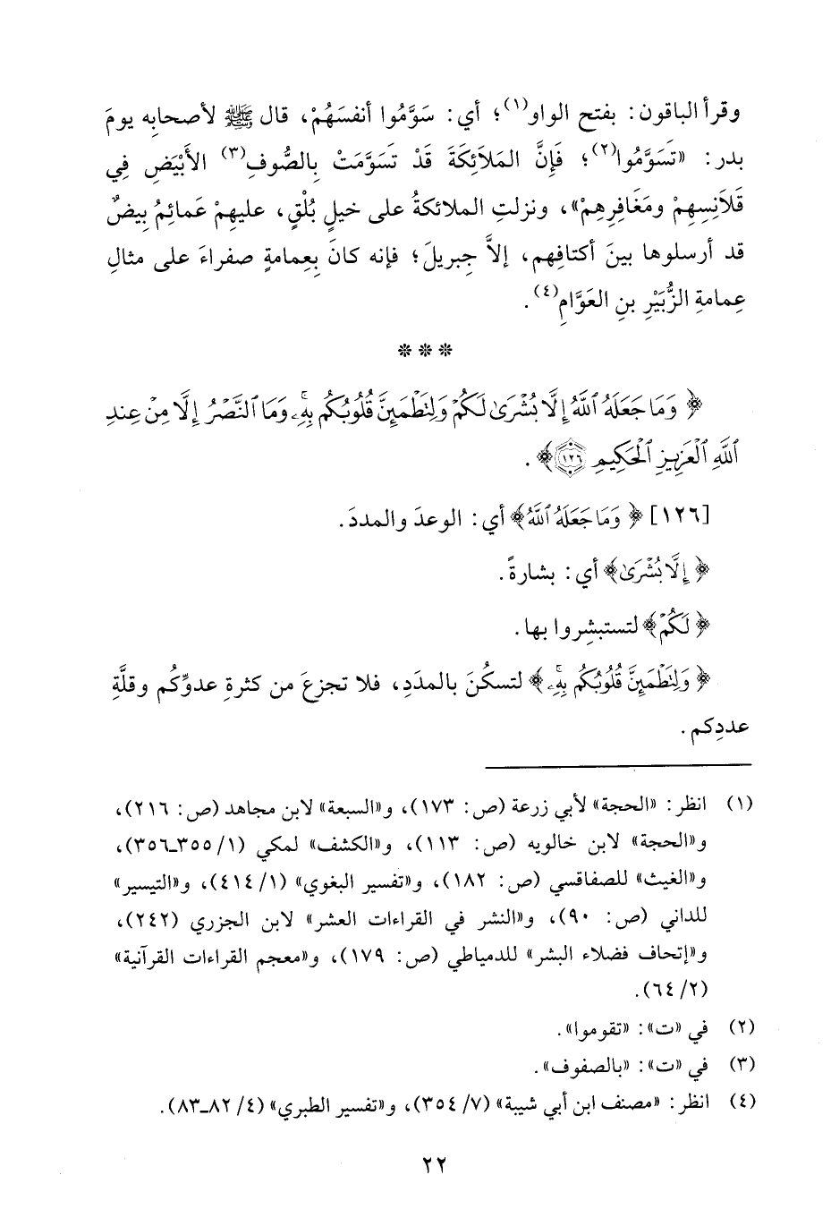 وقرأ الباقون: بفتح الواو (¬1)؛ أي: سَوَّمُوا أنفسَهُمْ، قال - صلى الله عليه وسلم - لأصحابِه يومَ بدر: "تسَوَّمُوا (¬2)؛ فَإِنَّ المَلاَئِكَةَ قَدْ تسَوَّمَتْ بِالصُّوفِ (¬3) الأَبْيَضِ فِي قَلاَنِسِهِمْ ومَغَافِرِهِمْ"، ونزلتِ الملائكةُ على خيلٍ بُلْقٍ، عليهِمْ عَمائِمُ بِيضٌ قد أرسلوها بينَ أكتافِهم، إلَّا جِبريلَ؛ فإنه كانَ بِعِمامةٍ صفراءَ على مثالِ عِمامةِ الزُّبَيْرِ بنِ العَوَّامِ (¬4).