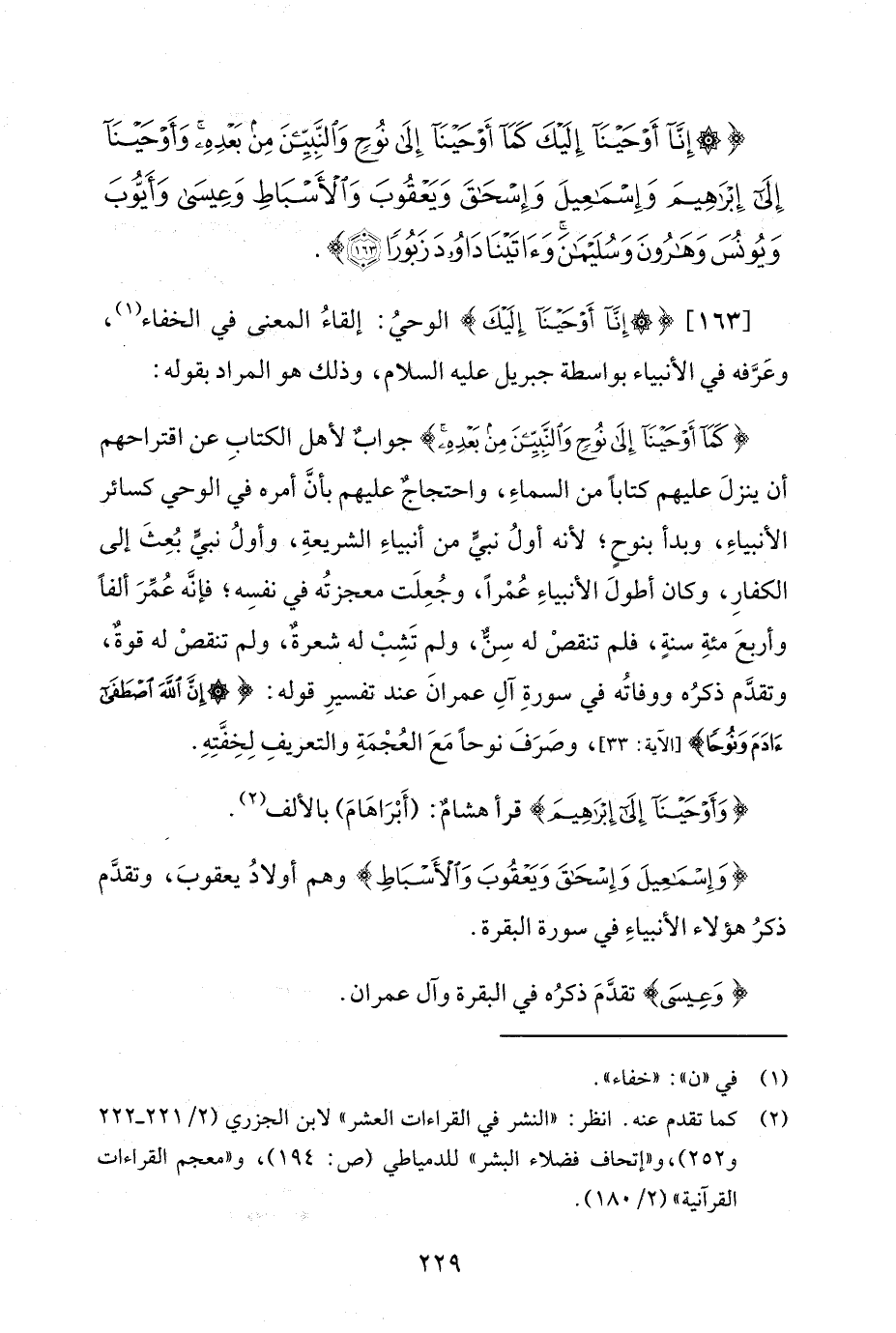 [163] {إِنَّا أَوْحَيْنَا إِلَيْكَ} الوحيُ: إلقاءُ المعنى في الخفاء (¬1)، وعَرَّفه في الأنبياء بواسطة جبريل عليه السلام، وذلك هو المراد بقوله:
