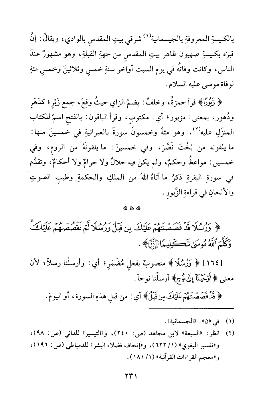 {زَبُورًا} قرأ حمزةُ، وخلفٌ: بضمِّ الزاي حيثُ وقعَ، جمع زَبْرٍ؛ كدَهْرٍ ودُهور، بمعنى: مزبور؛ أي: مكتوبٍ، وقرأ الباقون: بالفتحِ اسمٌ للكتاب المنزَلِ عليه (¬2)، وهو مئةٌ وخمسونَ سورةً بالعبرانيةِ في خمسينَ منها: ما يلقونه من بُخْتَ نَصَّرَ، وفي خمسينَ: ما يلقونَهُ من الرومِ، وفي خمسين: مواعظُ وحكمٌ، ولم يكنْ فيه حلالٌ ولا حرامٌ ولا أحكامٌ، وتقدَّم في سورةِ البقرةِ ذكرُ ما آتاهُ اللهُ من الملكِ والحكمةِ وطيبِ الصوتِ والألحانِ في قراءةِ الزَّبورِ.