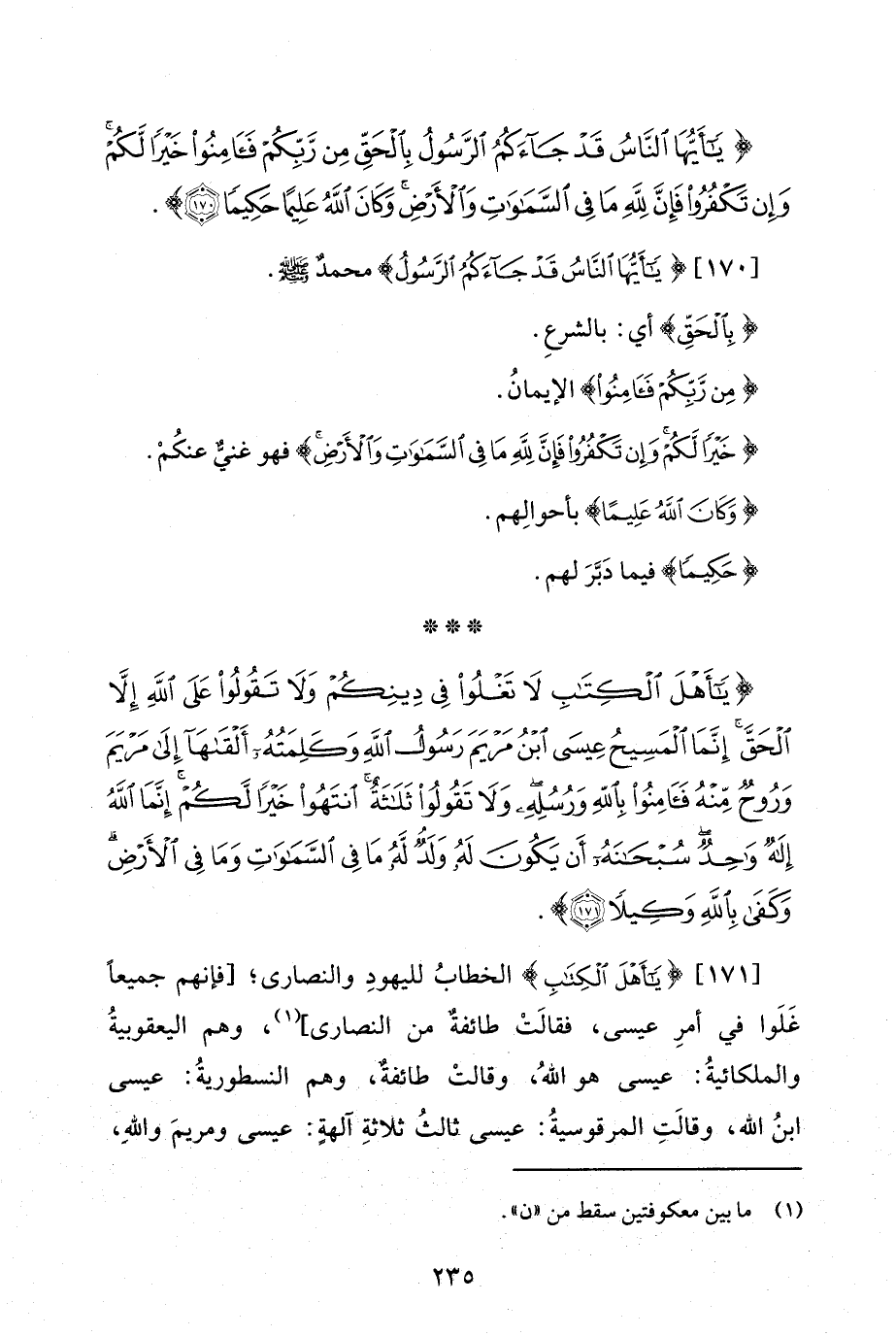 {يَاأَهْلَ الْكِتَابِ لَا تَغْلُوا فِي دِينِكُمْ وَلَا تَقُولُوا عَلَى اللَّهِ إِلَّا الْحَقَّ إِنَّمَا الْمَسِيحُ عِيسَى ابْنُ مَرْيَمَ رَسُولُ اللَّهِ وَكَلِمَتُهُ أَلْقَاهَا إِلَى مَرْيَمَ وَرُوحٌ مِنْهُ فَآمِنُوا بِاللَّهِ وَرُسُلِهِ وَلَا تَقُولُوا ثَلَاثَةٌ انْتَهُوا خَيْرًا لَكُمْ إِنَّمَا اللَّهُ إِلَهٌ وَاحِدٌ سُبْحَانَهُ أَنْ يَكُونَ لَهُ وَلَدٌ لَهُ مَا فِي السَّمَاوَاتِ وَمَا فِي الْأَرْضِ وَكَفَى بِاللَّهِ وَكِيلًا (171)}.