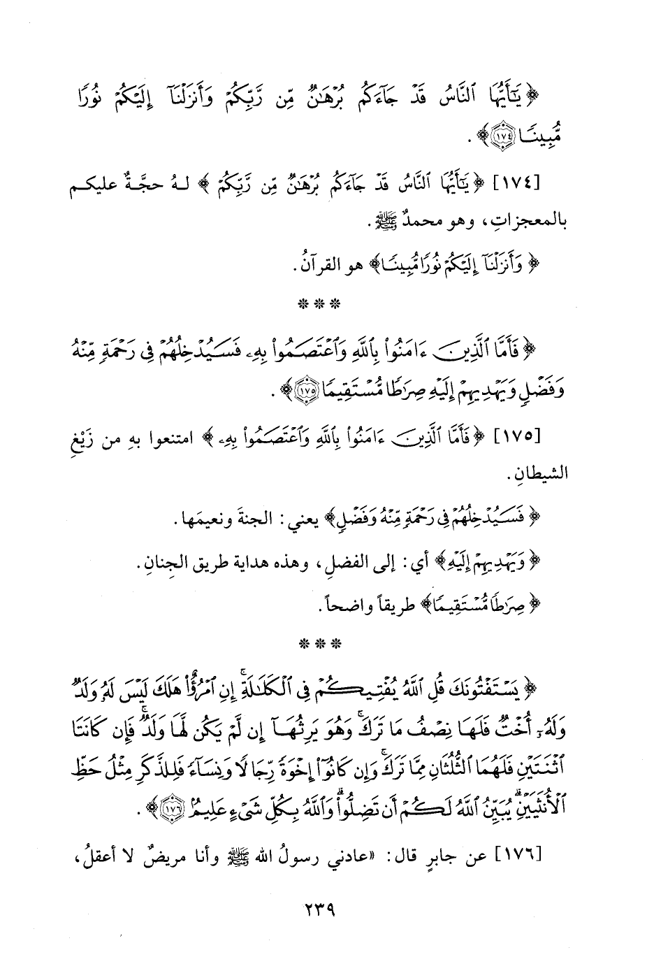 [174] {يَاأَيُّهَا النَّاسُ قَدْ جَاءَكُمْ بُرْهَانٌ مِنْ رَبِّكُمْ} لهُ حجَّةٌ عليكم بالمعجزاتِ، وهو محمدٌ - صلى الله عليه وسلم -.