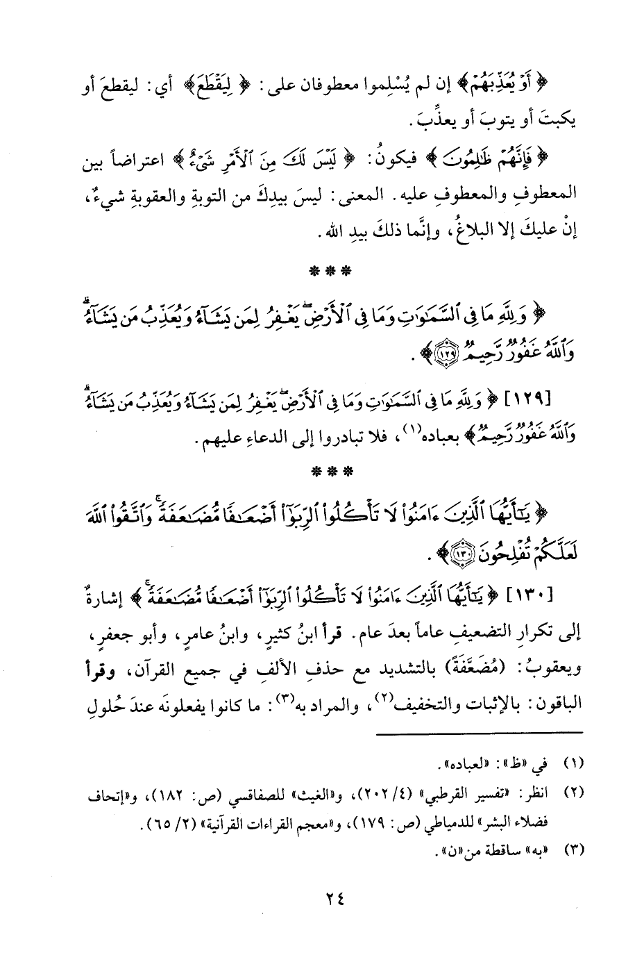 [130] {يَاأَيُّهَا الَّذِينَ آمَنُوا لَا تَأْكُلُوا الرِّبَا أَضْعَافًا مُضَاعَفَةً} إشارةٌ إلى تكرارِ التضعيفِ عامًا بعدَ عام. قرأ ابنُ كثيرٍ، وابنُ عامرٍ، وأبو جعفرٍ، ويعقوبُ: (مُضَعَّفَةً) بالتشديد مع حذفِ الألفِ في جميع القرآن، وقرأ الباقون: بالإثبات والتخفيف (¬2)، والمراد به (¬3): ما كانوا يفعلونَه عندَ حُلولِ