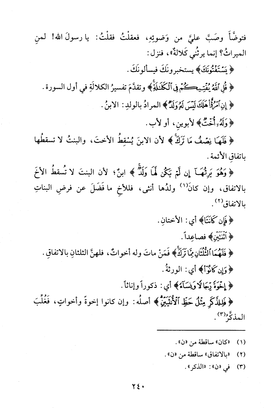 فتوضَّأَ وصَبَّ عليَّ من وَضوئِهِ، فعقلْتُ فقلْتُ: يا رسولَ الله! لمنِ الميراثُ؟ إنما يرثنُي كَلالةٌ"، فنزل: