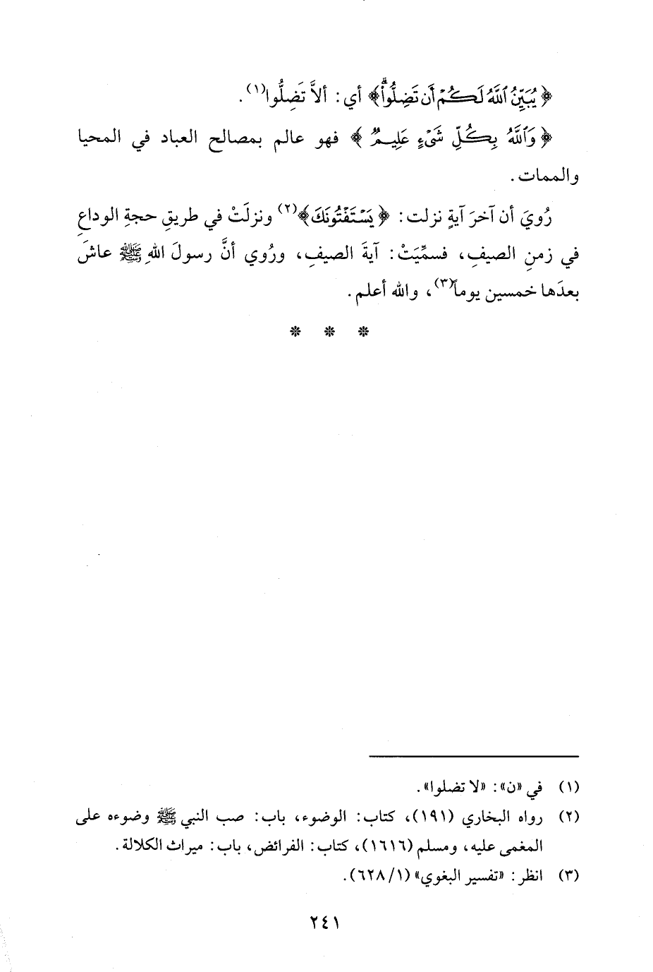 رُويَ أن آخرَ آيةٍ نزلت: {يَسْتَفْتُونَكَ} (¬2) ونزلَتْ في طريقِ حجةِ الوداعِ في زمنِ الصيفِ، فسمِّيَتْ: آيةَ الصيفِ، ورُوي أنَّ رسولَ اللهِ - صلى الله عليه وسلم - عاشَ بعدَها خمسين يومًا (¬3)، والله أعلم.