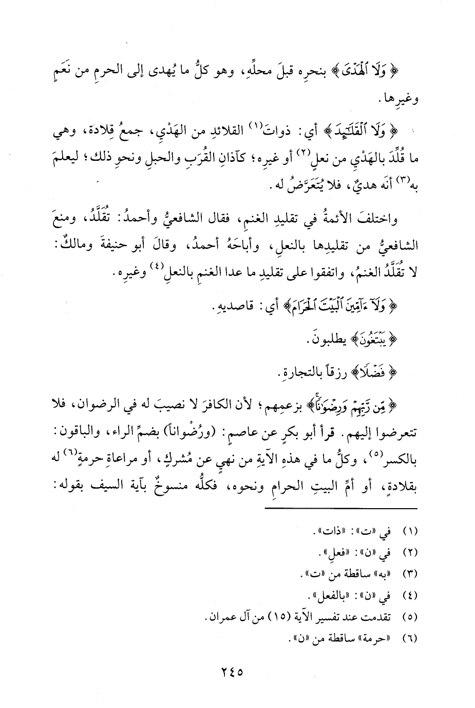 {وَلَا الْقَلَائِدَ} أي: ذواتَ (¬1) القلائدِ من الهَدْيِ، جمعُ قِلادة، وهي ما قُلِّدَ بالهَدْيِ من نعلٍ (¬2) أو غيرِه؛ كآذانِ القُرَبِ والحبلِ ونحوِ ذلك؛ ليعلمَ به (¬3) أنَّه هديٌ، فلا يُتَعَرَّضُ له.