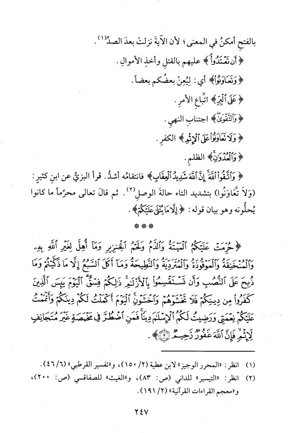 {وَاتَّقُوا اللَّهَ إِنَّ اللَّهَ شَدِيدُ الْعِقَابِ} فانتقامُه أشدُّ. قرأ البزيُّ عن ابنِ كثيرٍ: (وَلاَ تَّعَاوَنُوا) بتشديد التاء حالةَ الوصلِ (¬2). ثم قالَ تعالى محرِّمًا ما كانوا يُحلُّونه وهو بيان قوله: {إِلَّا مَا يُتْلَى عَلَيْكُمْ}.