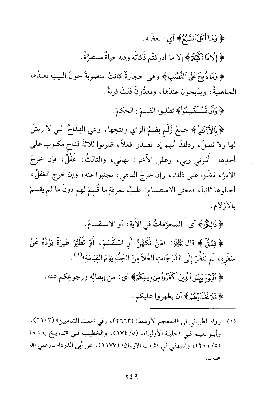 {وَمَا ذُبِحَ عَلَى النُّصُبِ} وهي حجارةٌ كانتْ منصوبةً حولَ البيتِ يعبدُها الجاهليةُ، ويذبحون عندَها، ويعدُّونَ ذلكَ قربةً.
