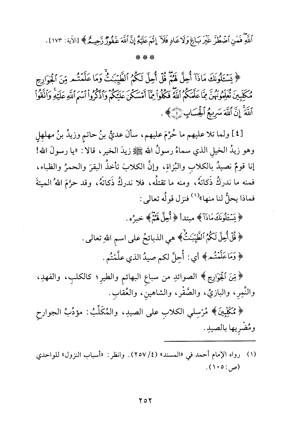 {يَسْأَلُونَكَ مَاذَا أُحِلَّ لَهُمْ قُلْ أُحِلَّ لَكُمُ الطَّيِّبَاتُ وَمَا عَلَّمْتُمْ مِنَ الْجَوَارِحِ مُكَلِّبِينَ تُعَلِّمُونَهُنَّ مِمَّا عَلَّمَكُمُ اللَّهُ فَكُلُوا مِمَّا أَمْسَكْنَ عَلَيْكُمْ وَاذْكُرُوا اسْمَ اللَّهِ عَلَيْهِ وَاتَّقُوا اللَّهَ إِنَّ اللَّهَ سَرِيعُ الْحِسَابِ (4)}.