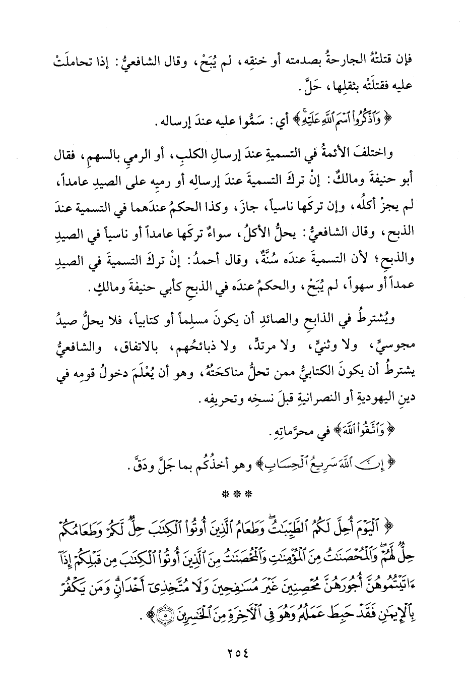 {الْيَوْمَ أُحِلَّ لَكُمُ الطَّيِّبَاتُ وَطَعَامُ الَّذِينَ أُوتُوا الْكِتَابَ حِلٌّ لَكُمْ وَطَعَامُكُمْ حِلٌّ لَهُمْ وَالْمُحْصَنَاتُ مِنَ الْمُؤْمِنَاتِ وَالْمُحْصَنَاتُ مِنَ الَّذِينَ أُوتُوا الْكِتَابَ مِنْ قَبْلِكُمْ إِذَا آتَيْتُمُوهُنَّ أُجُورَهُنَّ مُحْصِنِينَ غَيْرَ مُسَافِحِينَ وَلَا مُتَّخِذِي أَخْدَانٍ وَمَنْ يَكْفُرْ بِالْإِيمَانِ فَقَدْ حَبِطَ عَمَلُهُ وَهُوَ فِي الْآخِرَةِ مِنَ الْخَاسِرِينَ (5)}.