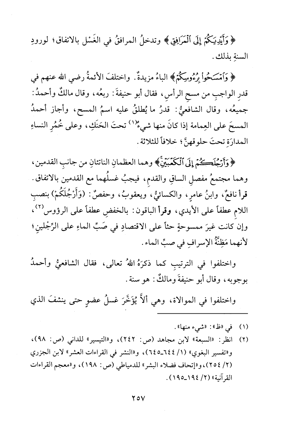{وَأَرْجُلَكُمْ إِلَى الْكَعْبَيْنِ} وهما العظمانِ الناتئانِ من جانبِ القدمين، وهما مجتمعُ مفصلِ الساقِ والقدمِ، فيجبُ غسلُهما مع القدمين بالاتفاق. قرأ نافعٌ، وابنُ عامرٍ، والكسائيُّ، ويعقوبُ، وحفصٌ: (وَأَرْجُلَكُمْ) بنصبِ اللامِ عطفًا على الأيدي، وقرأ الباقون: بالخفضِ عطفًا على الرؤوس (¬2)، وإن كانت غيرَ ممسوحةٍ حثًّا على الاقتصادِ في صَبِّ الماءِ على الرِّجْلينِ؛ لأنهما مَظِنَّةُ الإسرافِ في صبِّ الماء.