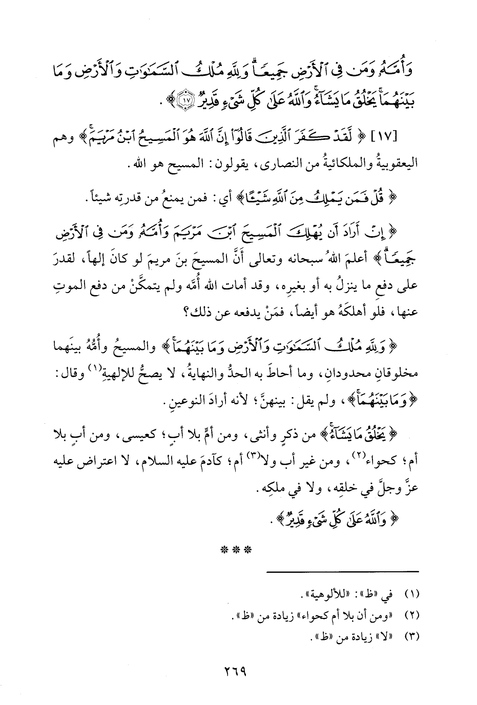 {وَلِلَّهِ مُلْكُ السَّمَاوَاتِ وَالْأَرْضِ وَمَا بَيْنَهُمَا} والمسيحُ وأُمُّهُ بينَهما مخلوقانِ محدودانِ، وما أحاطَ به الحدُّ والنهايةُ، لا يصحُّ للإلهيةِ (¬1) وقال: {وَمَا بَيْنَهُمَا}، ولم يقل: بينهنَّ؛ لأنه أرادَ النوعينِ.