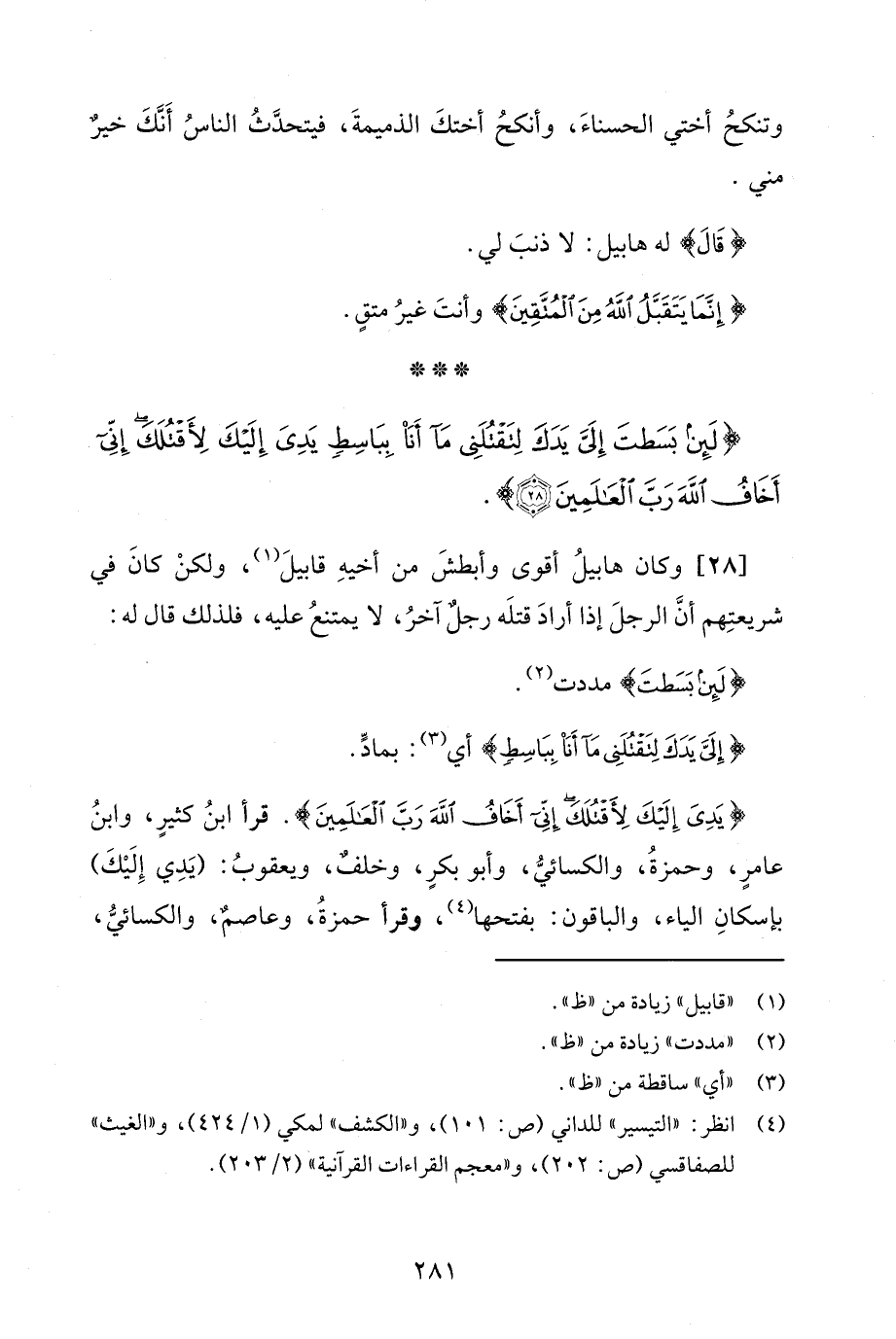 {يَدِيَ إِلَيْكَ لِأَقْتُلَكَ إِنِّي أَخَافُ اللَّهَ رَبَّ الْعَالَمِينَ}. قرأ ابنُ كثيرٍ، وابنُ عامرٍ، وحمزةُ، والكسائيُّ، وأبو بكرٍ، وخلفٌ، ويعقوبُ: (يَدِي إِلَيْكَ) بإسكانِ الياء، والباقون: بفتحها (¬4)، وقرأ حمزةُ، وعاصمٌ، والكسائيُّ،