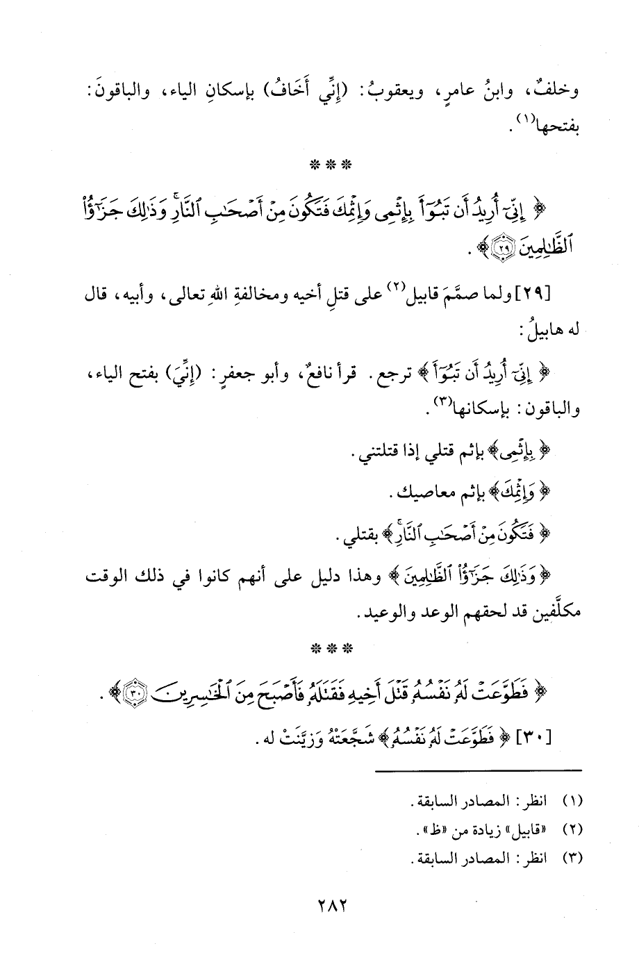 {إِنِّي أُرِيدُ أَنْ تَبُوءَ} ترجع. قرأ نافعٌ، وأبو جعفرٍ: (إِنِّيَ) بفتح الياء، والباقون: بإسكانها (¬3).