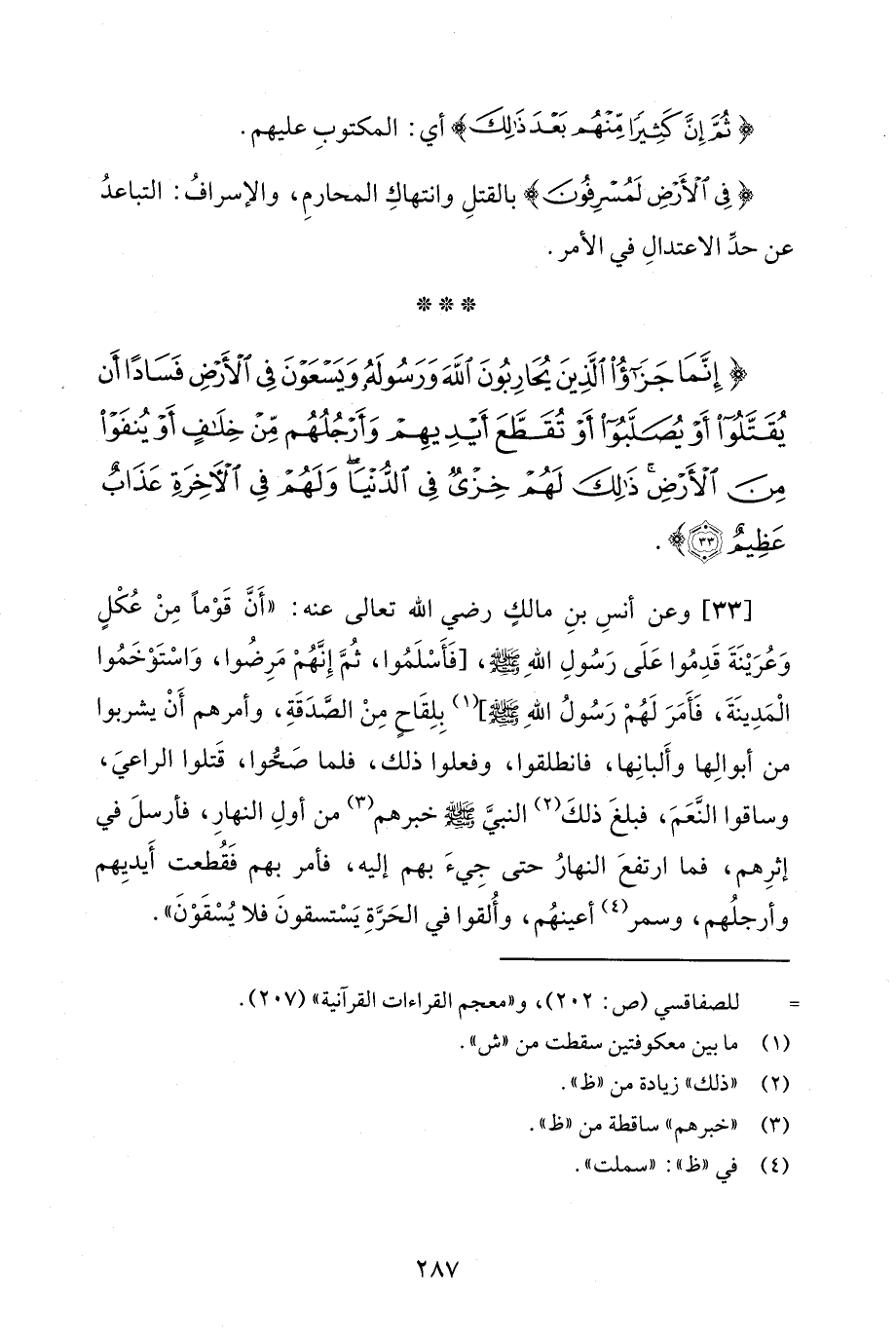[33] وعن أنسِ بنِ مالكٍ رضي الله تعالى عنه: "أَنَّ قَوْمًا مِنْ عُكْلٍ وَعُرَيْنَةَ قَدِمُوا عَلَى رَسُولِ اللهِ - صلى الله عليه وسلم -، [فَأَسْلَمُوا، ثُمَّ إِنَّهُمْ مَرِضُوا، وَاسْتَوْخَمُوا الْمَدِينَةَ، فَأَمَرَ لَهُمْ رَسُولُ اللهِ - صلى الله عليه وسلم -] (¬1) بِلِقَاحِ مِنْ الصَّدَقَةِ، وأمرهم أَنْ يشربوا من أبوالِها وأَلبانِها، فانطلقوا، وفعلوا ذلك، فلما صَحُّوا، قَتلوا الراعيَ، وساقوا النَّعَمَ، فبلغَ ذلكَ (¬2) النبيَّ - صلى الله عليه وسلم - خبرهم (¬3) من أولِ النهارِ، فأرسلَ في إثرِهم، فما ارتفعَ النهارُ حتى جِيءَ بهم إليه، فأمر بهم فَقُطعت أَيديِهم وأرجلُهم، وسمر (¬4) أعينهُم، وأُلقوا في الحَرَّةِ يَسْتسقونَ فلا يُسْقَوْنَ".