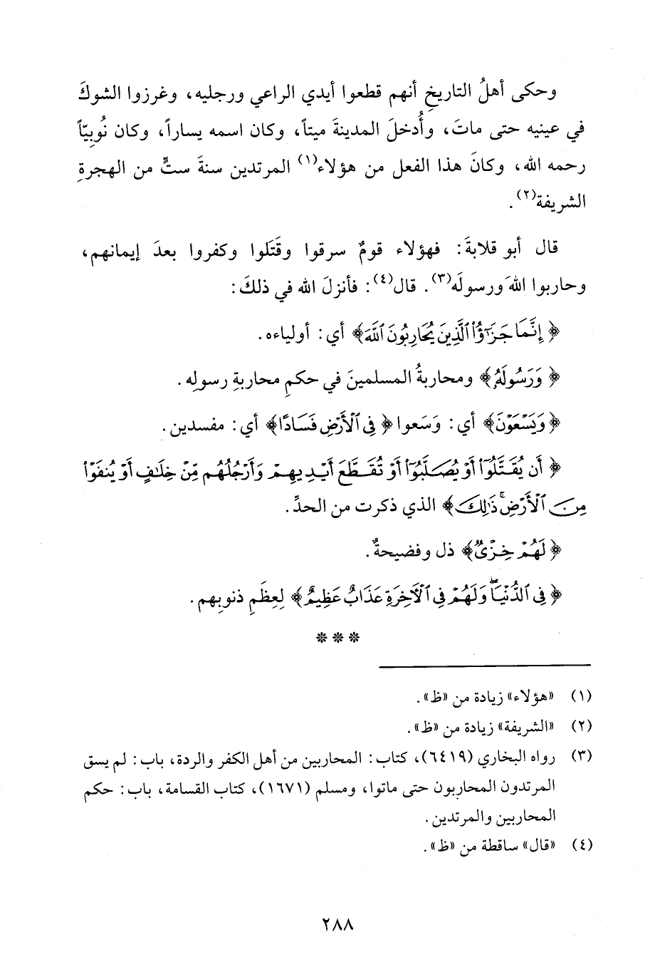 (¬3) رواه البخاري (6419)، كتاب: المحاربين من أهل الكفر والردة، باب: لم يسق المرتدون المحاربون حتى ماتوا، ومسلم (1671)، كتاب القسامة، باب: حكم المحاربين والمرتدين.