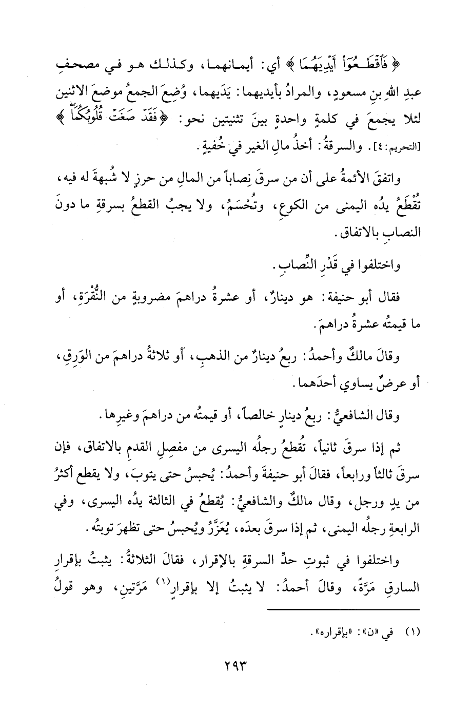 واتفقَ الأئمةُ على أن من سرقَ نِصابًا من المالِ من حرزٍ لا شُبهةَ له فيه، تُقْطَعُ يدُه اليمنى من الكوعِ، وتُحْسَمُ، ولا يجبُ القطعُ بسرقةِ ما دونَ النصابِ بالاتفاق.