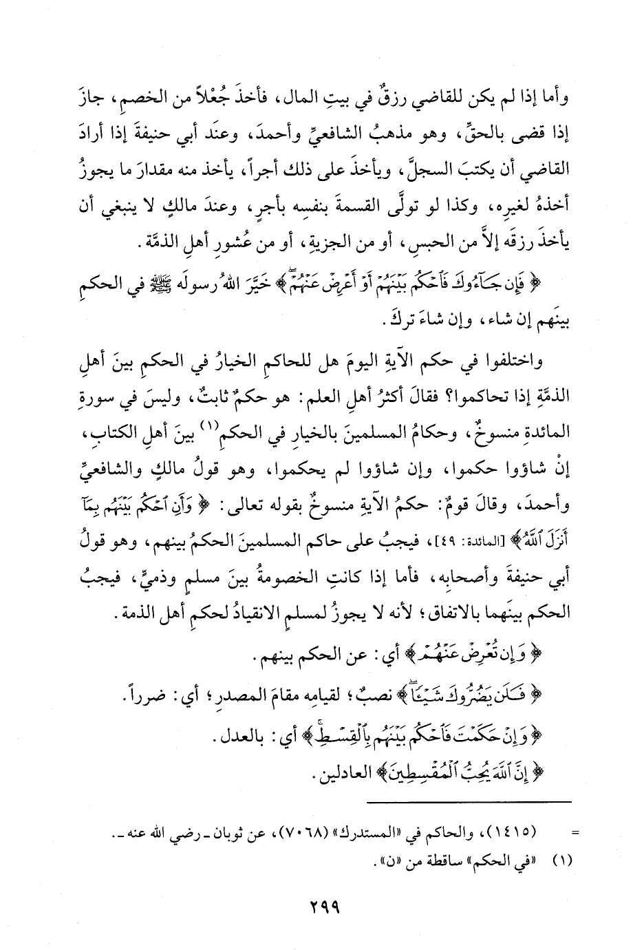 واختلفوا في حكم الآيةِ اليومَ هل للحاكمِ الخيارُ في الحكمِ بينَ أهلِ الذمَّةِ إذا تحاكموا؟ فقالَ أكثرُ أهلِ العلم: هو حكم ثابتٌ، وليسَ في سورةِ المائدةِ منسوخٌ، وحكامُ المسلمينَ بالخيارِ في الحكمِ (¬1) بينَ أهلِ الكتابِ، إنْ شاؤوا حكموا، وإن شاؤوا لم يحكموا، وهو قولُ مالكٍ والشافعيِّ وأحمدَ، وقالَ قومٌ: حكمُ الآيةِ منسوخٌ بقوله تعالى: {وَأَنِ احْكُمْ بَيْنَهُمْ بِمَا أَنْزَلَ اللَّهُ} [المائدة: 49]، فيجبُ على حاكم المسلمينَ الحكمُ بينهم، وهو قولُ أبي حنيفةَ وأصحابِه، فأما إذا كانتِ الخصومةُ بينَ مسلمٍ وذميٍّ، فيجبُ الحكم بينَهما بالاتفاق؛ لأنه لا يجوزُ لمسلمٍ الانقيادُ لحكمِ أهل الذمة.
