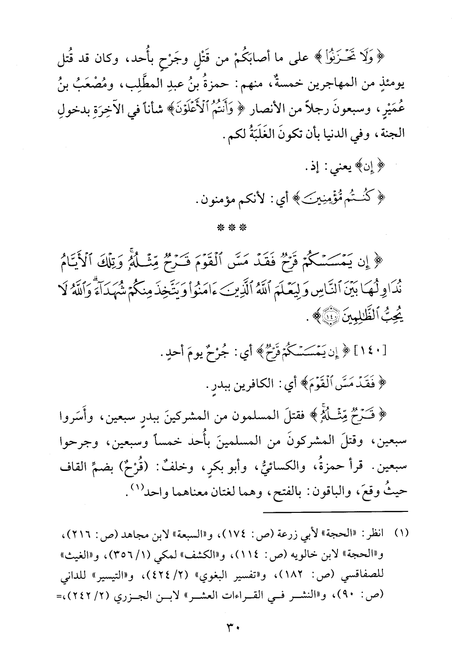 {قَرْحٌ مِثْلُهُ} فقتلَ المسلمون من المشركينَ ببدرٍ سبعين، وأَسَروا سبعين، وقتلَ المشركونَ من المسلمينَ بأُحد خمسًا وسبعين، وجرحوا سبعين. قرأ حمزةُ، والكسائيُّ، وأبو بكرٍ، وخلفٌ: (قُرْحٌ) بضمِّ القاف حيثُ وقعَ، والباقون: بالفتح، وهما لغتان معناهما واحد (¬1).