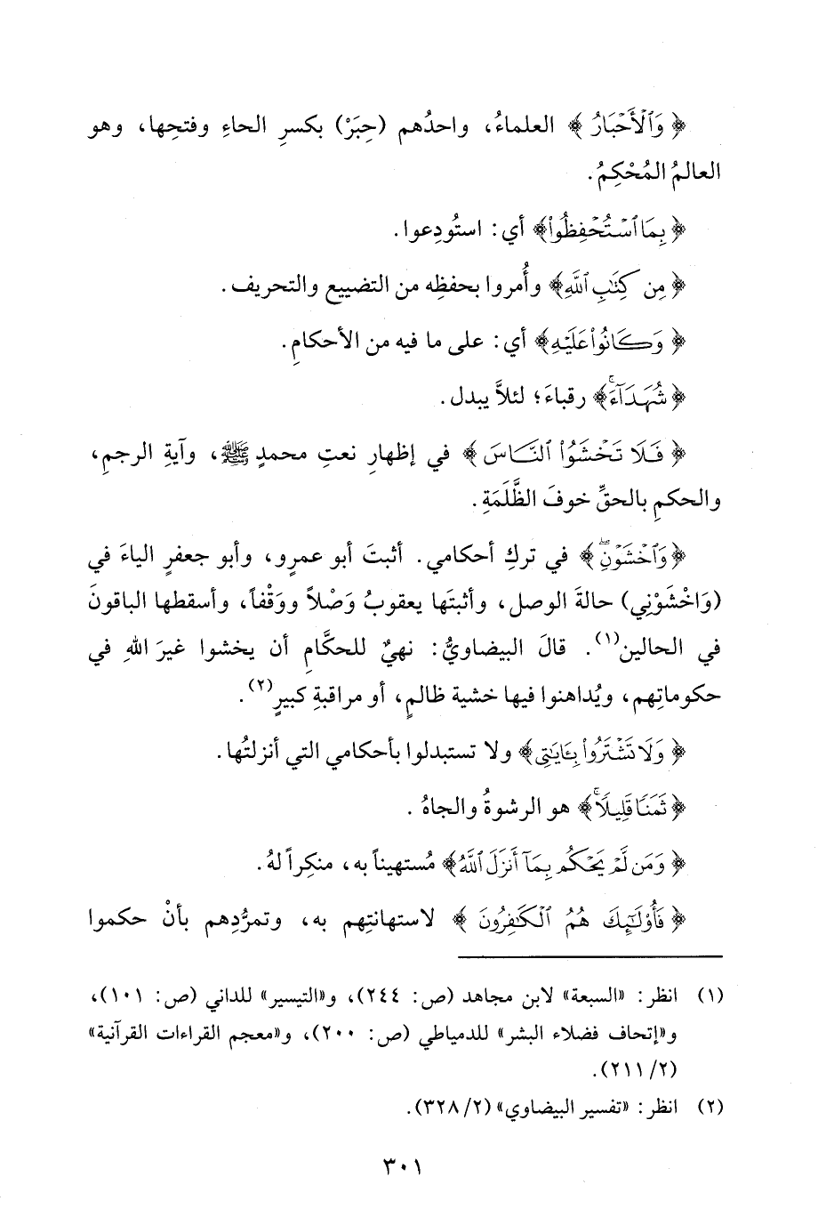 {وَاخْشَوْنِ} في تركِ أحكامي. أثبتَ أبو عمرٍو، وأبو جعفرٍ الياءَ في (وَاخْشوْنِي) حالةَ الوصل، وأثبتَها يعقوبُ وَصْلًا ووَقْفًا، وأسقطها الباقونَ في الحالين (¬1). قالَ البيضاويُّ: نهيٌ للحكَّامِ أن يخشوا غيرَ اللهِ في حكوماتِهم، ويُداهنوا فيها خشية ظالمٍ، أو مراقبةِ كبيرٍ (¬2).