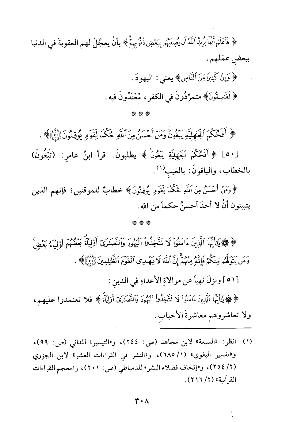 [50] {أَفَحُكْمَ الْجَاهِلِيَّةِ يَبْغُونَ} يطلبونَ. قرأ ابنُ عامرٍ: (تبْغُونَ) بالخطاب، والباقونَ: بالغيبِ (¬1).