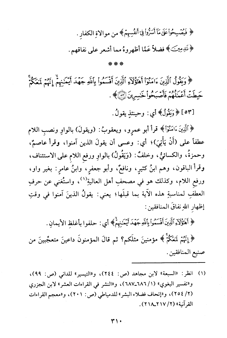 {الَّذِينَ آمَنُوا} قرأ أبو عمرٍو، ويعقوبُ: (ويقولَ) بالواوِ ونصبِ اللام عطفًا على (أَنْ يَأْتِيَ)؛ أي: وعسى أن يقولَ الذين آمنوا، وقرأ عاصمٌ، وحمزةُ، والكسائيُّ، وخلفٌ: (وَيَقُولُ) بالواوِ ورفعِ اللامِ على الاستئناف، وقرأ الباقون، وهم ابنُ كثيرٍ، ونافعٌ، وأبو جعفرٍ، وابنُ عامرٍ: بغير واو، ورفعِ اللام، وكذلك هو في مصحفِ أهل العاليةِ (¬1)، واستُغني عن حرفِ العطفِ لمناسبةِ هذه الآية بما قبلَها؛ يعني: يقولُ الذينَ آمنوا في وقتِ إظهارِ اللهِ نفاقَ المنافقين: