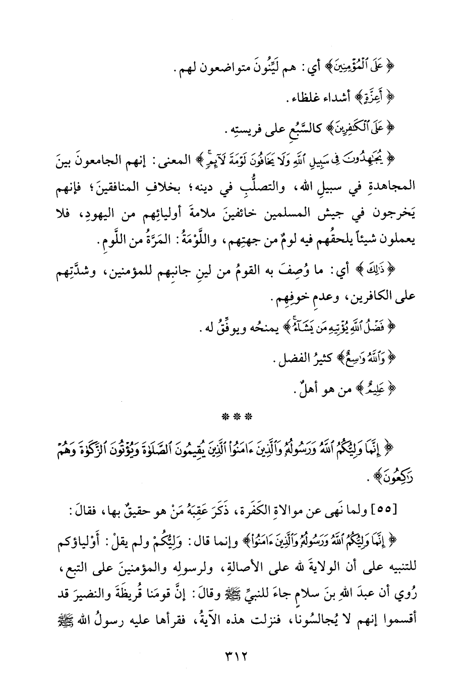 [55] ولما نَهى عن موالاةِ الكَفَرة، ذَكَرَ عَقِبَهُ مَنْ هو حقيقٌ بها، فقالَ: