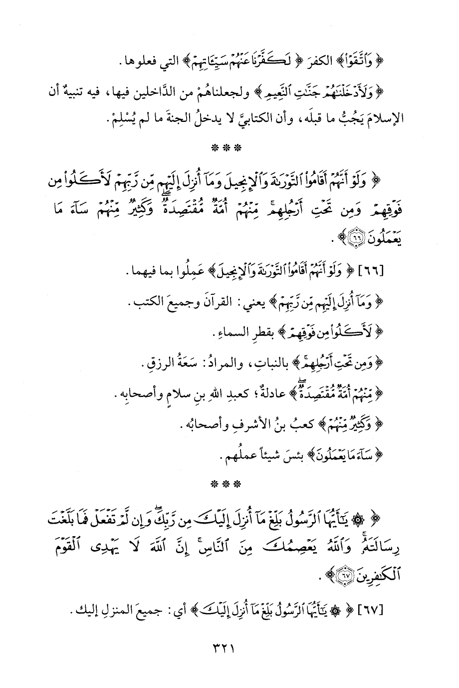 {وَلَوْ أَنَّهُمْ أَقَامُوا التَّوْرَاةَ وَالْإِنْجِيلَ وَمَا أُنْزِلَ إِلَيْهِمْ مِنْ رَبِّهِمْ لَأَكَلُوا مِنْ فَوْقِهِمْ وَمِنْ تَحْتِ أَرْجُلِهِمْ مِنْهُمْ أُمَّةٌ مُقْتَصِدَةٌ وَكَثِيرٌ مِنْهُمْ سَاءَ مَا يَعْمَلُونَ (66)}.