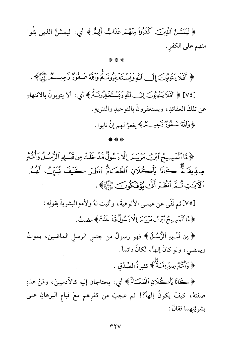 [74] {أَفَلَا يَتُوبُونَ إِلَى اللَّهِ وَيَسْتَغْفِرُونَهُ} أي: ألا يتوبونَ بالانتهاءِ عن تلكَ العقائدِ، ويستغفرونَ بالتوحيدِ والتنزيهِ.