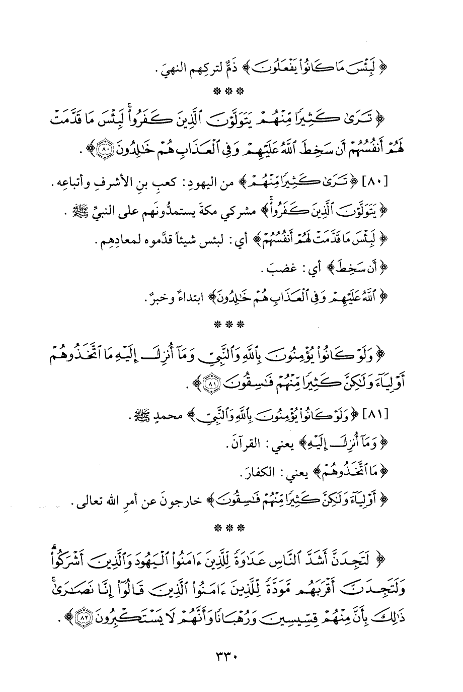 {تَرَى كَثِيرًا مِنْهُمْ يَتَوَلَّوْنَ الَّذِينَ كَفَرُوا لَبِئْسَ مَا قَدَّمَتْ لَهُمْ أَنْفُسُهُمْ أَنْ سَخِطَ اللَّهُ عَلَيْهِمْ وَفِي الْعَذَابِ هُمْ خَالِدُونَ (80)}.