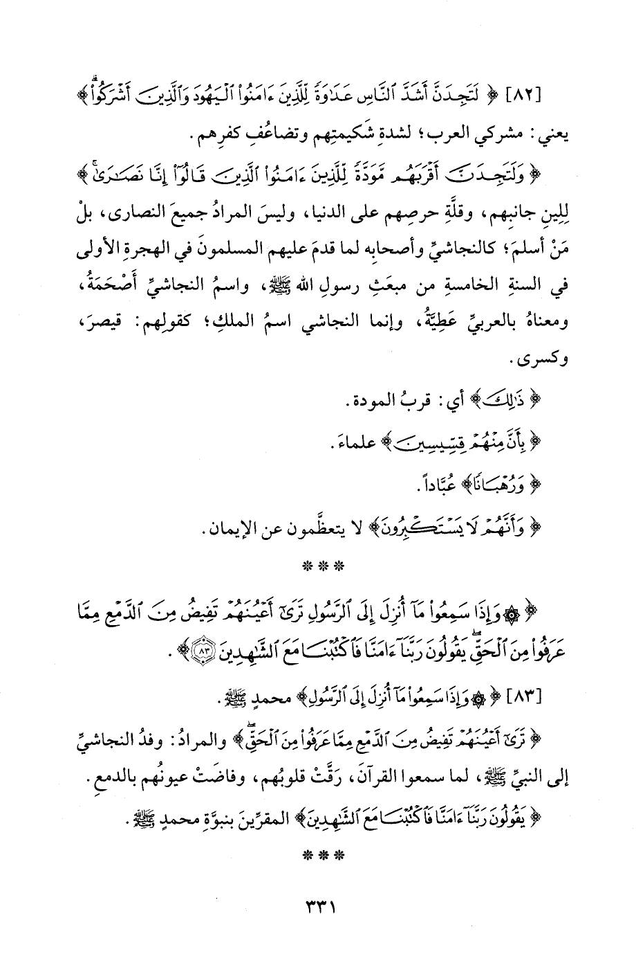 {وَلَتَجِدَنَّ أَقْرَبَهُمْ مَوَدَّةً لِلَّذِينَ آمَنُوا الَّذِينَ قَالُوا إِنَّا نَصَارَى} لِلِينِ جانبِهم، وقلَّةِ حرصِهم على الدنيا، وليسَ المرادُ جميعَ النصارى، بلْ مَنْ أسلمَ؛ كالنجاشيِّ وأصحابِه لما قدمَ عليهم المسلمونَ في الهجرةِ الأولى في السُّنةِ الخامسةِ من مبعَثِ رسولِ الله - صلى الله عليه وسلم -، واسمُ النجاشيِّ أَصْحَمَةُ، ومعناهُ بالعربيِّ عَطِيَّةُ، وإنما النجاشي اسمُ الملكِ؛ كقولهم: قيصرَ، وكسرى.