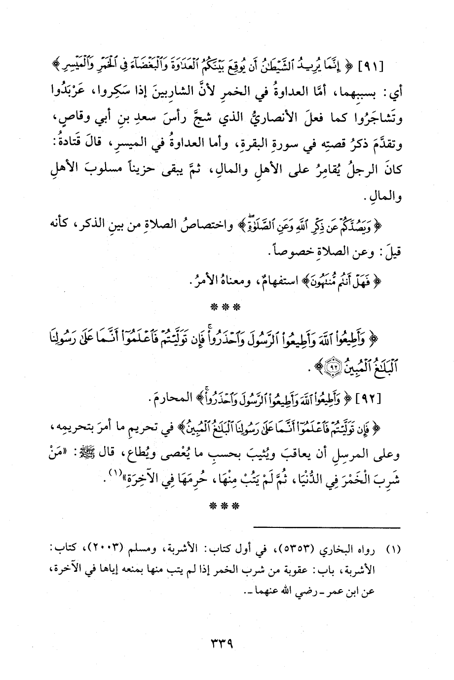 [91] {إِنَّمَا يُرِيدُ الشَّيْطَانُ أَنْ يُوقِعَ بَيْنَكُمُ الْعَدَاوَةَ وَالْبَغْضَاءَ فِي الْخَمْرِ وَالْمَيْسِرِ} أي: بسببِهما، أمَّا العداوةُ في الخمرِ لأنَّ الشارِبينَ إذا سَكِروا، عَرْبَدُوا وتَشاجَرُوا كما فعلَ الأنصاريُّ الذي شجَّ رأسَ سعدِ بنِ أبي وقاصٍ، وتقدَّمَ ذكرُ قصتِه في سورةِ البقرةِ، وأما العداوةُ في الميسرِ، قالَ قَتادةُ: كانَ الرجلُ يُقامِرُ على الأهلِ والمالِ، ثمَّ يبقى حزينًا مسلوبَ الأهلِ والمالِ.