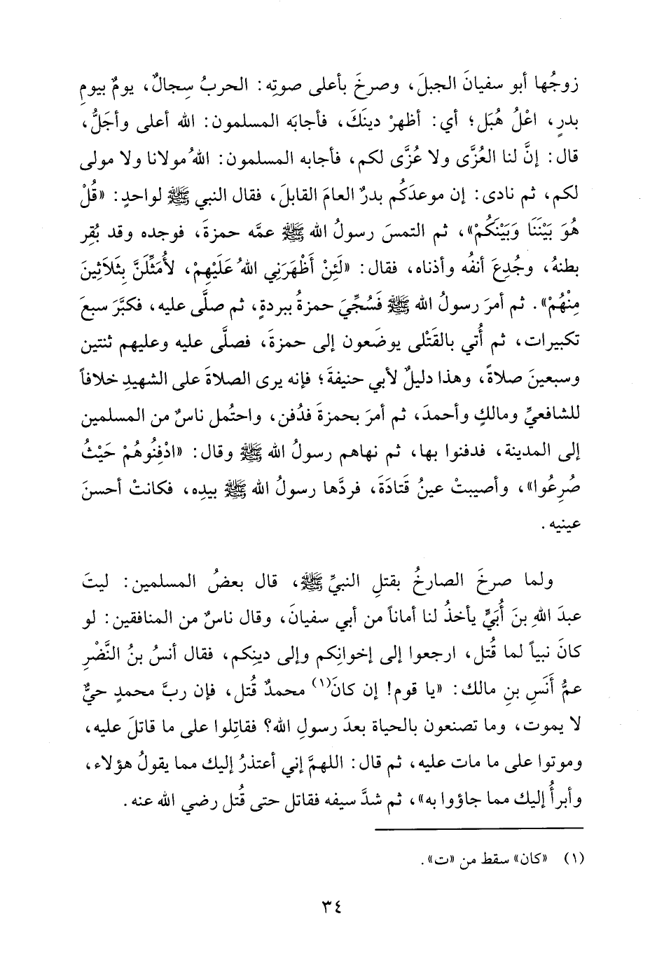 زوجُها أبو سفيانَ الجبلَ، وصرخَ بأعلى صوته: الحربُ سِجالٌ، يومٌ بيومِ بدرٍ، اعْلُ هُبَل؛ أي: أظهرْ دينَكَ، فأجابَه المسلمون: الله أعلى وأجَلُّ، قال: إنَّ لنا العُزَّى ولا عُزَّى لكم، فأجابه المسلمون: اللهُ مولانا ولا مولى لكم، ثم نادى: إن موعدَكُم بدرٌ العامَ القابلَ، فقال النبي - صلى الله عليه وسلم - لواحدٍ: "قُلْ هُوَ بَيْنَنَا وَبَيْنَكُمْ"، ثم التمسَ رسولُ الله - صلى الله عليه وسلم - عمَّه حمزةَ، فوجده وقد بُقِر بطنهُ، وجُدِعَ أنفُه وأذناه، فقال: "لَئِنْ أَظْهَرَنِي اللهُ عَلَيْهِمْ، لأُمَثِّلَنَّ بِثَلاَثِينَ مِنْهُمْ". ثم أمرَ رسولُ الله - صلى الله عليه وسلم - فَسُجِّيَ حمزةُ ببردةٍ، ثم صلَّى عليه، فكبَّرَ سبعَ تكبيرات، ثم أُتي بالقَتْلى يوضَعون إلى حمزةَ، فصلَّى عليه وعليهم ثنتين وسبعينَ صلاةً، وهذا دليل لأبي حنيفةَ؛ فإنه يرى الصلاةَ على الشهيدِ خلافًا للشافعيِّ ومالكٍ وأحمدَ، ثم أمرَ بحمزةَ فدُفن، واحتُمل ناسٌ من المسلمين إلى المدينة، فدفنوا بها، ثم نهاهم رسولُ الله - صلى الله عليه وسلم - وقال: "ادْفِنُوهُمْ حَيْثُ صُرِعُوا"، وأصيبتْ عينُ قَتادَةَ، فردَّها رسولُ الله - صلى الله عليه وسلم - بيدِه، فكانتْ أحسنَ عينيه.
