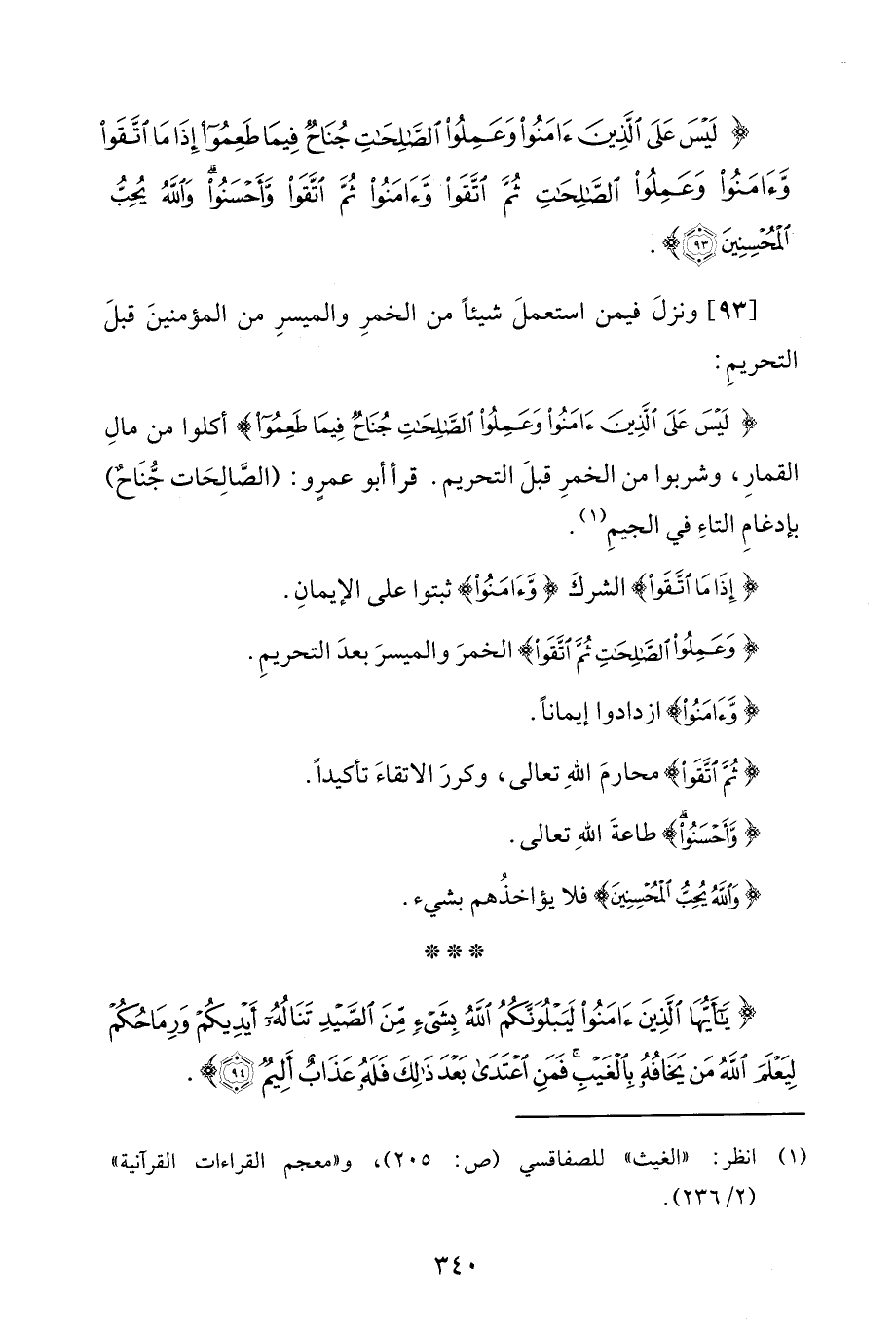{لَيْسَ عَلَى الَّذِينَ آمَنُوا وَعَمِلُوا الصَّالِحَاتِ جُنَاحٌ فِيمَا طَعِمُوا} أكلوا من مالِ القمارِ، وشربوا من الخمرِ قبلَ التحريم. قرأ أبو عمرٍو: (الصَّالِحَات جنَاحٌ) بإدغامِ التاءِ في الجيمِ (¬1).
