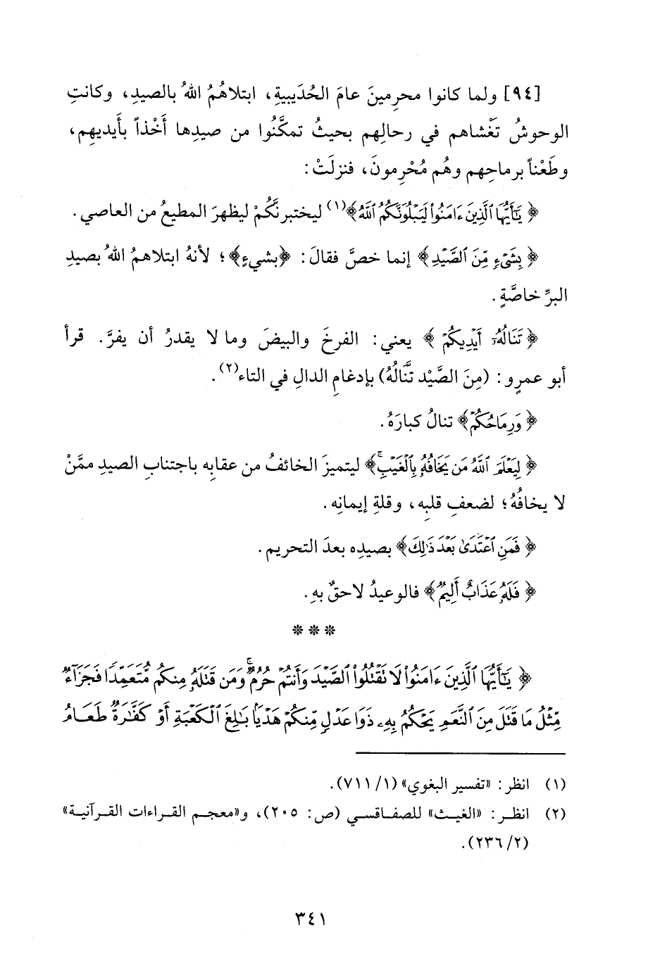 {يَاأَيُّهَا الَّذِينَ آمَنُوا لَا تَقْتُلُوا الصَّيْدَ وَأَنْتُمْ حُرُمٌ وَمَنْ قَتَلَهُ مِنْكُمْ مُتَعَمِّدًا فَجَزَاءٌ مِثْلُ مَا قَتَلَ مِنَ النَّعَمِ يَحْكُمُ بِهِ ذَوَا عَدْلٍ مِنْكُمْ هَدْيًا بَالِغَ الْكَعْبَةِ أَوْ كَفَّارَةٌ طَعَامُ