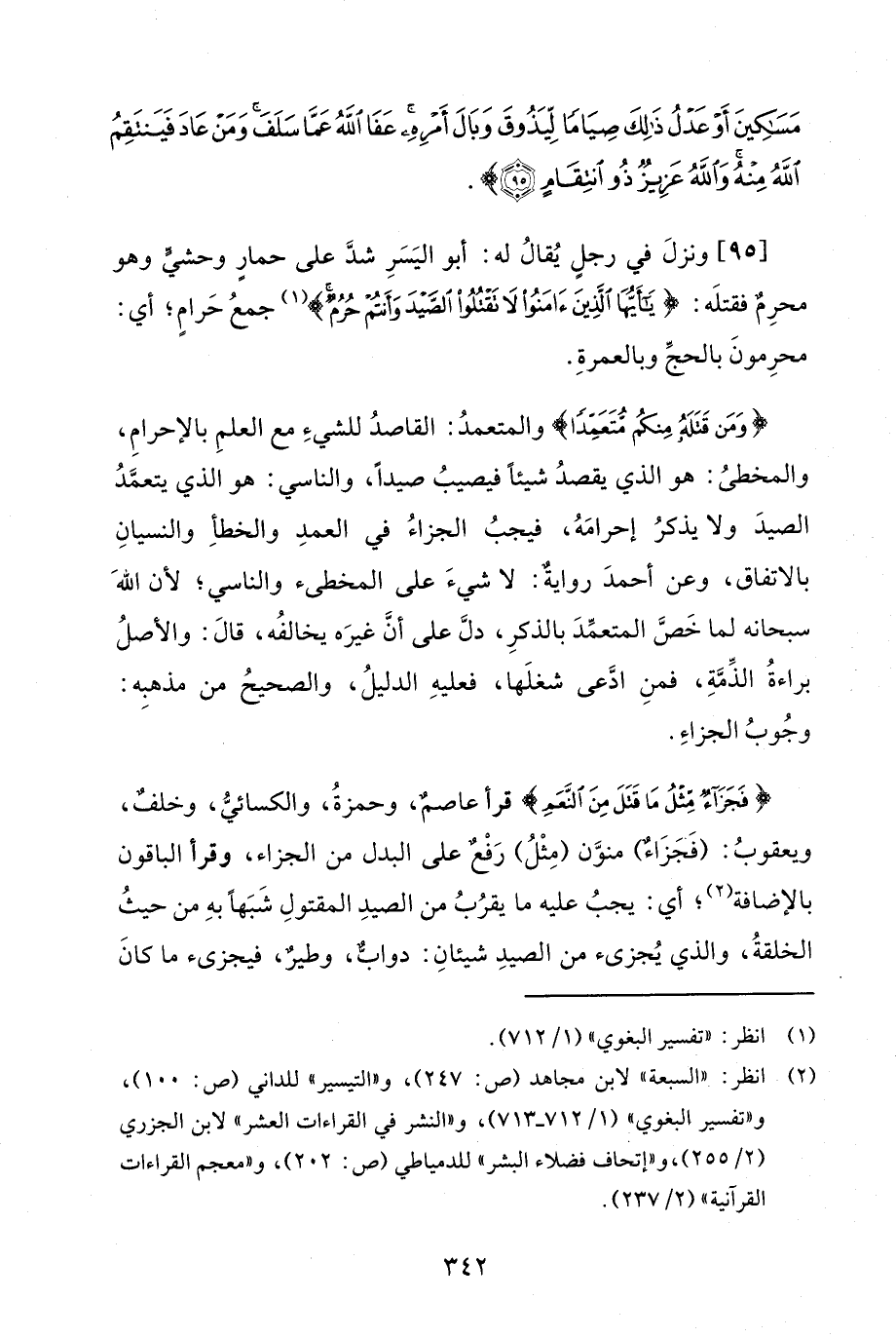 [95] ونزلَ في رجل يُقالُ له: أبو اليَسَرِ شدَّ على حمارٍ وحشيٍّ وهو محرِمٌ فقتلَه: {يَاأَيُّهَا الَّذِينَ آمَنُوا لَا تَقْتُلُوا الصَّيْدَ وَأَنْتُمْ حُرُمٌ} (¬1) جمعُ حَرامٍ؛ أي: محرِمونَ بالحجِّ وبالعمرةِ.