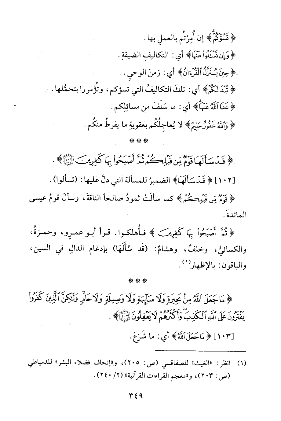 [102] {قَدْ سَأَلَهَا} الضميرُ للمسألة التي دلَّ عليها: (تسألوا).