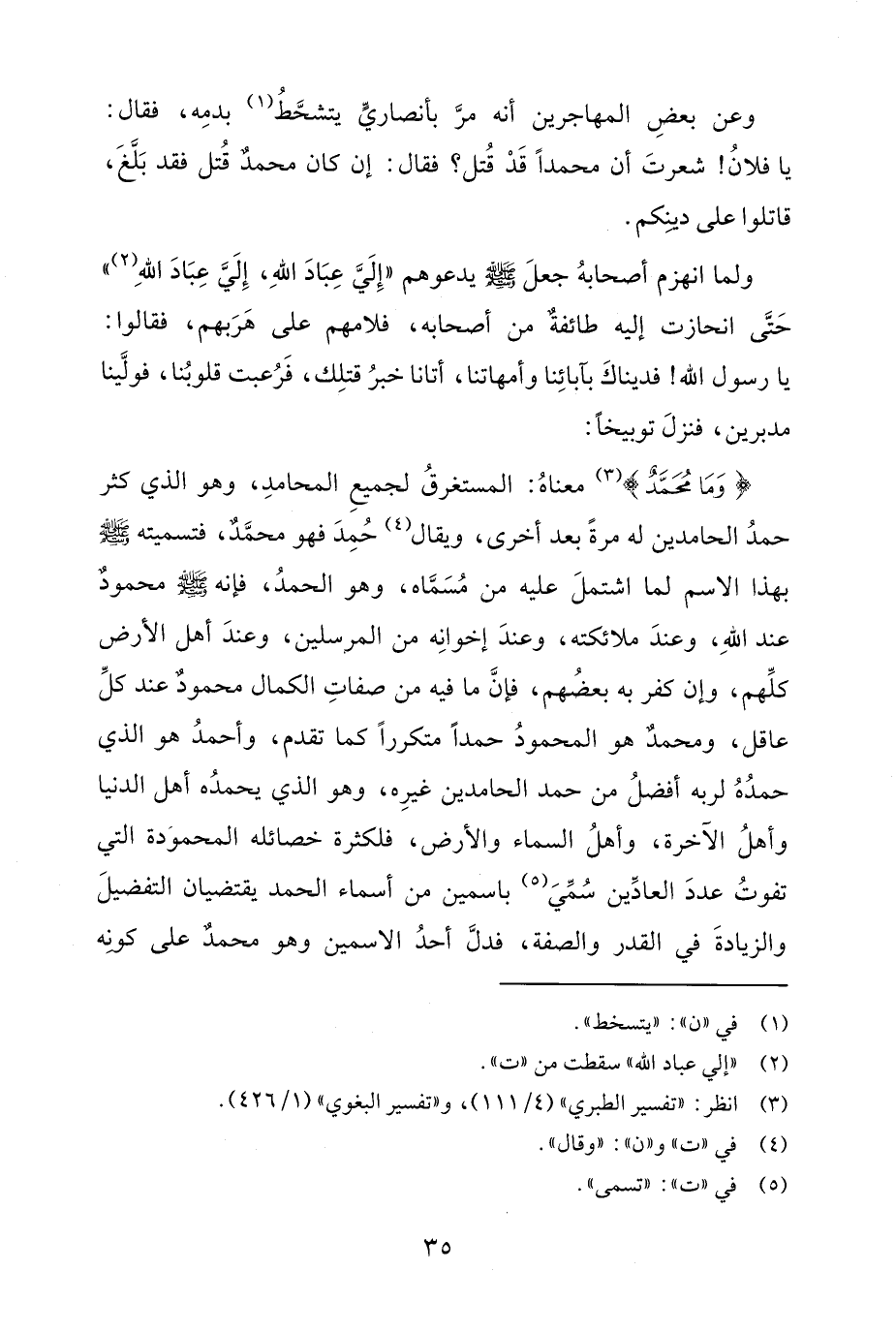 وعن بعضِ المهاجرين أنه مرَّ بأنصاريٍّ يتشحَّطُ (¬1) بدمِه، فقال: يا فلانُ! شعرتَ أن محمدًا قَدْ قُتل؟ فقال: إن كان محمدٌ قُتل فقد بَلَّغَ، قاتلوا على دينِكم.