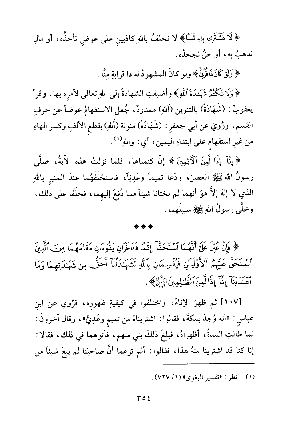 {فَإِنْ عُثِرَ عَلَى أَنَّهُمَا اسْتَحَقَّا إِثْمًا فَآخَرَانِ يَقُومَانِ مَقَامَهُمَا مِنَ الَّذِينَ اسْتَحَقَّ عَلَيْهِمُ الْأَوْلَيَانِ فَيُقْسِمَانِ بِاللَّهِ لَشَهَادَتُنَا أَحَقُّ مِنْ شَهَادَتِهِمَا وَمَا اعْتَدَيْنَا إِنَّا إِذًا لَمِنَ الظَّالِمِينَ (107)}.